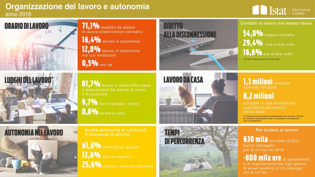 Sul punto l’Istituto Nazionale di Statistica ha condotto un’indagine dal titolo “ L’organizzazione del lavoro in Italia : Orari, luoghi e grado di autonomia “con ulteriori spunti di riflessione su una realtà, come quella italiana, restia a cambiamento e innovazione.