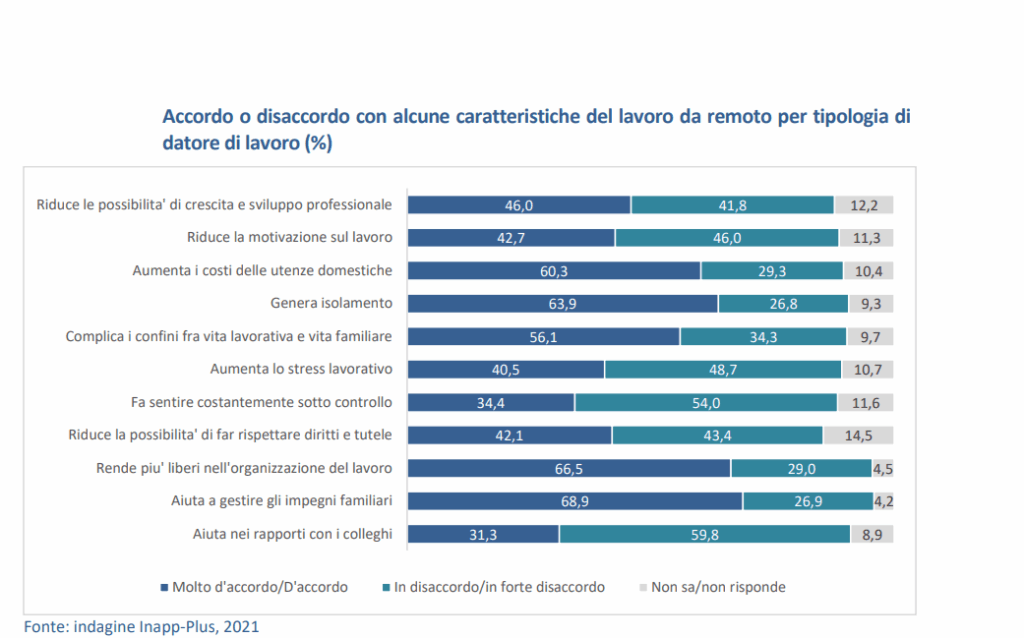 Sono solo alcuni aspetti evidenziati dal paper realizzato dall’Istituto Nazionale per l’Analisi delle Politiche pubbliche (INAPP) intitolato “Il lavoro da remoto: le modalità attuative, gli strumenti e il punto di vista dei lavoratori”, un’indagine svolta su un campione di oltre 45mila interviste (dai 18 ai 74 anni) nel periodo marzo-luglio 2021.